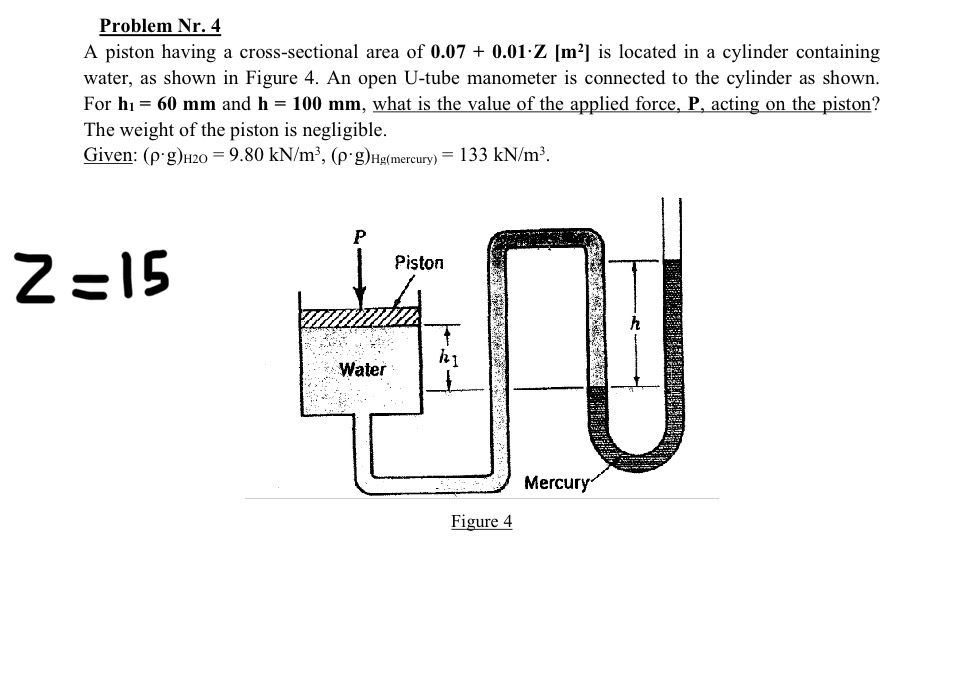 0.07+0.01*Z[m^(2)]is located in a cylinder containing water, as shown in Figure 4. An open U-tube manometer is connected to the cylinder as shown. For