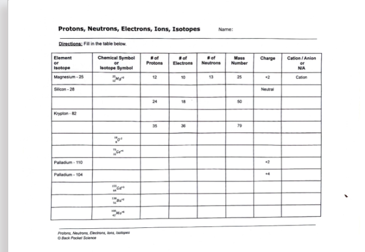 Protons, Neutrons, Electrons, Ions, Isotopes Name: Directions: Fill in the table below. \table[[\table[[Element],[or],[Isotope]],\table[[Chemical Symbol],[or],[Isotope Symbol]],\table[[E of],[Protons]],\table[[3 of],[Electrons]],\table[[E of],[Neutrons]],\table[[Mass],[Number]],Charge,\table[[Cation / Anion],[or],[N/A]]],[Magnesium - 25,