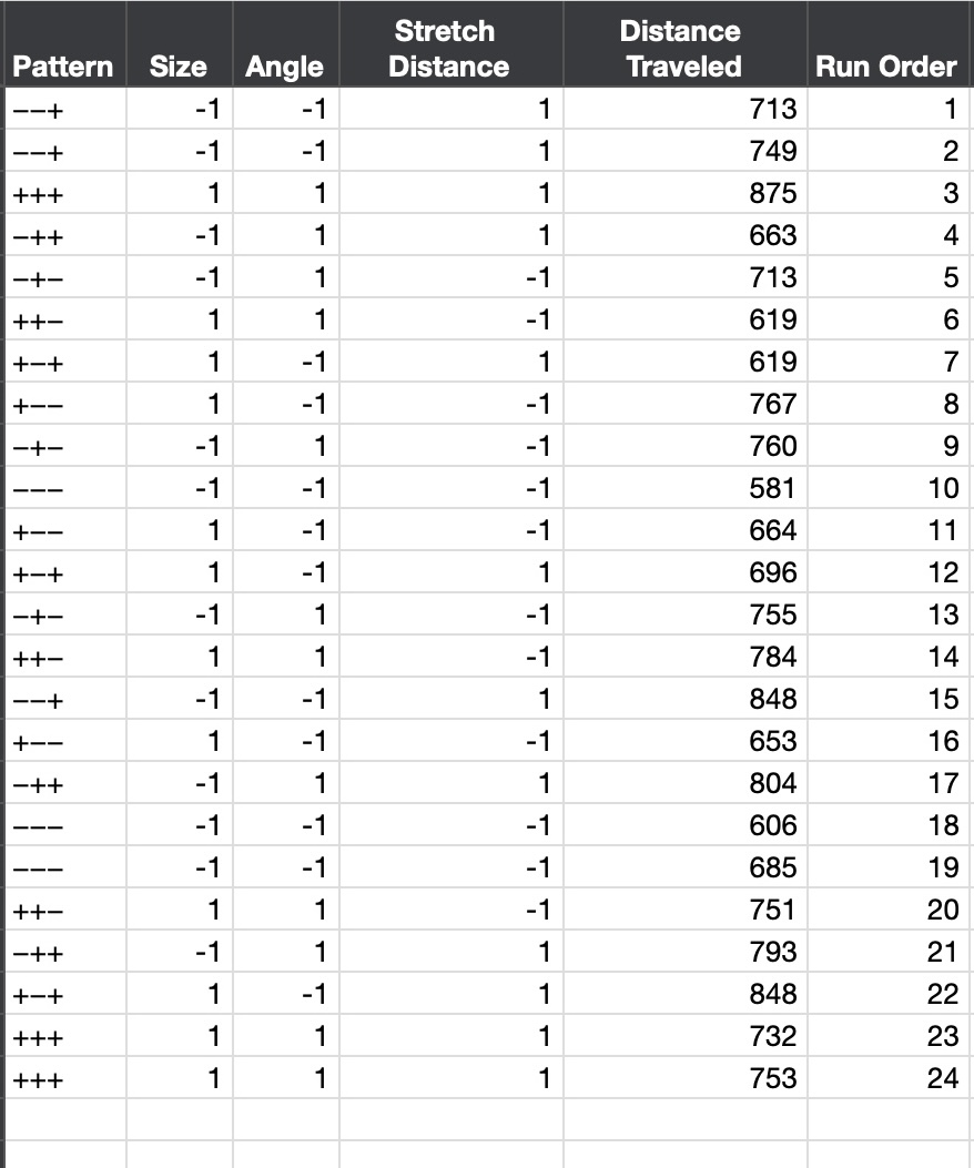 Provide steps in JMP. An exploratory data analysis that compares response(s) for the different levels of 3 factors – include appropriate graphs and descriptive statistics. No formal statistical analysis, just observational in JMP pro. Pattern Size Angle Distance Run order ??+ -1 -1 1 713 1 ??+ -1 -1 1 749 2 +++ 1 1 1 875 3 ?++ -1 1 1 663 4 ?+? -1 1 -1 713 5 ++? 1 1 -1 619 6 +?+ 1 -1 1 619 7 +?? 1 -1 -1 767 8 ?+? -1 1 -1 760 9 ??? -1 -1 -1 581 10 +?? 1 -1 -1 664 11 +?+ 1 -1 1 696 12 ?+? -1 1 -1 755 13 ++? 1 1 -1 784 14 ??+ -1 -1 1 848 15 +?? 1 -1 -1 653 16 ?++ -1 1 1 804 17 ??? -1 -1 -1 606 18 ??? -1 -1 -1 685 19 ++? 1 1 -1 751 20 ?++ -1 1 1 793 21 +?+ 1 -1 1 848 22 +++ 1 1 1 732 23 +++ 1 1 1 753 24 \begin{tabular}{|c|c|c|c|c|c|} \hline Pattern & Size & Angle & Stretch Distance & Distance Traveled & Run Order \\ \hline --+ & -1 & -1 & 1 & 713 & 1 \\ \hline --+ & -1 & -1 & 1 & 749 & 2 \\ \hline +++ & 1 & 1 & 1 & 875 & 3 \\ \hline -++ & -1 & 1 & 1 & 663 & 4 \\ \hline -+- & -1 & 1 & -1 & 713 & 5 \\ \hline ++- & 1 & 1 & -1 & 619 & 6 \\ \hline +-+ & 1 & -1 & 1 & 619 & 7 \\ \hline +-- & 1 & -1 & -1 & 767 & 8 \\ \hline -+- & -1 & 1 & -1 & 760 & 9 \\ \hline --- & -1 & -1 & -1 & 581 & 10 \\ \hline +-- & 1 & -1 & -1 & 664 & 11 \\ \hline +-+ & 1 & -1 & 1 & 696 & 12 \\ \hline -+- & -1 & 1 & -1 & 755 & 13 \\ \hline ++- & 1 & 1 & -1 & 784 & 14 \\ \hline --+ & -1 & -1 & 1 & 848 & 15 \\ \hline +-- & 1 & -1 & -1 & 653 & 16 \\ \hline -++ & -1 & 1 & 1 & 804 & 17 \\ \hline --- & -1 & -1 & -1 & 606 & 18 \\ \hline --- & -1 & -1 & -1 & 685 & 19 \\ \hline ++- & 1 & 1 & -1 & 751 & 20 \\ \hline -++ & -1 & 1 & 1 & 793 & 21 \\ \hline +-+ & 1 & -1 & 1 & 848 & 22 \\ \hline +++ & 1 & 1 & 1 & 732 & 23 \\ \hline +++ & 1 & 1 & 1 & 753 & 24 \\ \hline & & & & & \\ \hline \end{tabular}