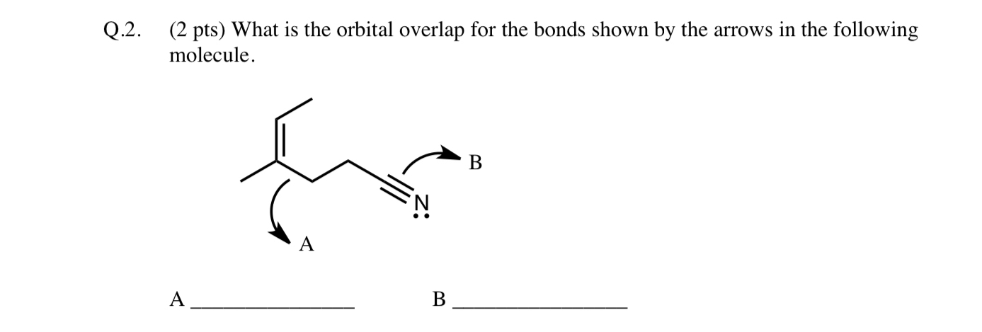 Q.2. (2 pts) What is the orbital overlap for the bonds shown by the arrows in the following molecule. A B