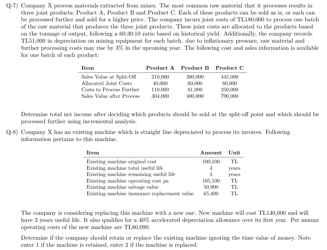 Q-7) Company X process materials extracted from mines. The most common raw material that it processes results in three joint products; Product A, Product B and Product C. Each of these products can be sold as is, or each can be processed further and sold for a higher price. The company incurs joint costs of TL180,000 to process one batch of the raw material that produces the three joint products. These joint costs are allocated to the products based on the tonnage of output, following a 60:30:10 ratio based on historical yield. Additionally, the company records TL51,000 in depreciation on mining equipment for each batch. due to inflationary pressure, raw material and further processing costs may rise by 3% in the upcoming year. The following cost and sales information is available for one batch of each product: Determine total net income after deciding which products should be sold at the split-off point and which should be processed further using incremental analysis. Q-8) Company X has an existing machine which is straight line depreciated to process its invoices. Following information pertains to this machine. The company is considering replacing this machine with a new one. New machine will cost TL140,000 and will have 3 years useful life. It also qualifies for a 40% accelerated depreciation allowance over its first year. Per annum operating costs of the new machine are TL80,090. Determine if the company should retain or replace the existing machine ignoring the time value of money. Note enter 1 if the machine is retained, enter 2 if the machine is replaced.