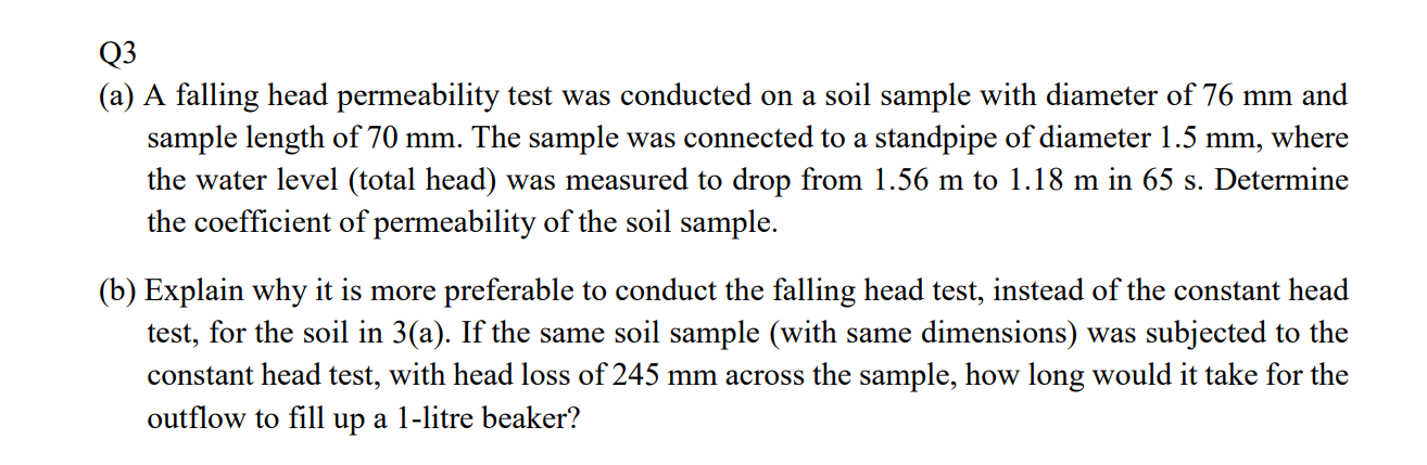 Q3 (a) A falling head permeability test was conducted on a soil sample with diameter of 76 mm and sample length of 70 mm . The sample was connected to a standpipe of diameter 1.5 mm , where the water level (total head) was measured to drop from 1.56 m to 1.18 m in 65 s . Determine the coefficient of permeability of the soil sample. (b) Explain why it is more preferable to conduct the falling head test, instead of the constant head test, for the soil in 3(a). If the same soil sample (with same dimensions) was subjected to the constant head test, with head loss of 245 mm across the sample, how long would it take for the outflow to fill up a 1 -litre beaker?