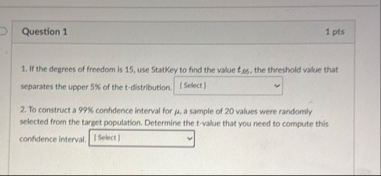 Question 1 1 pts If the degrees of freedom is 15 , use Statkey to find the value