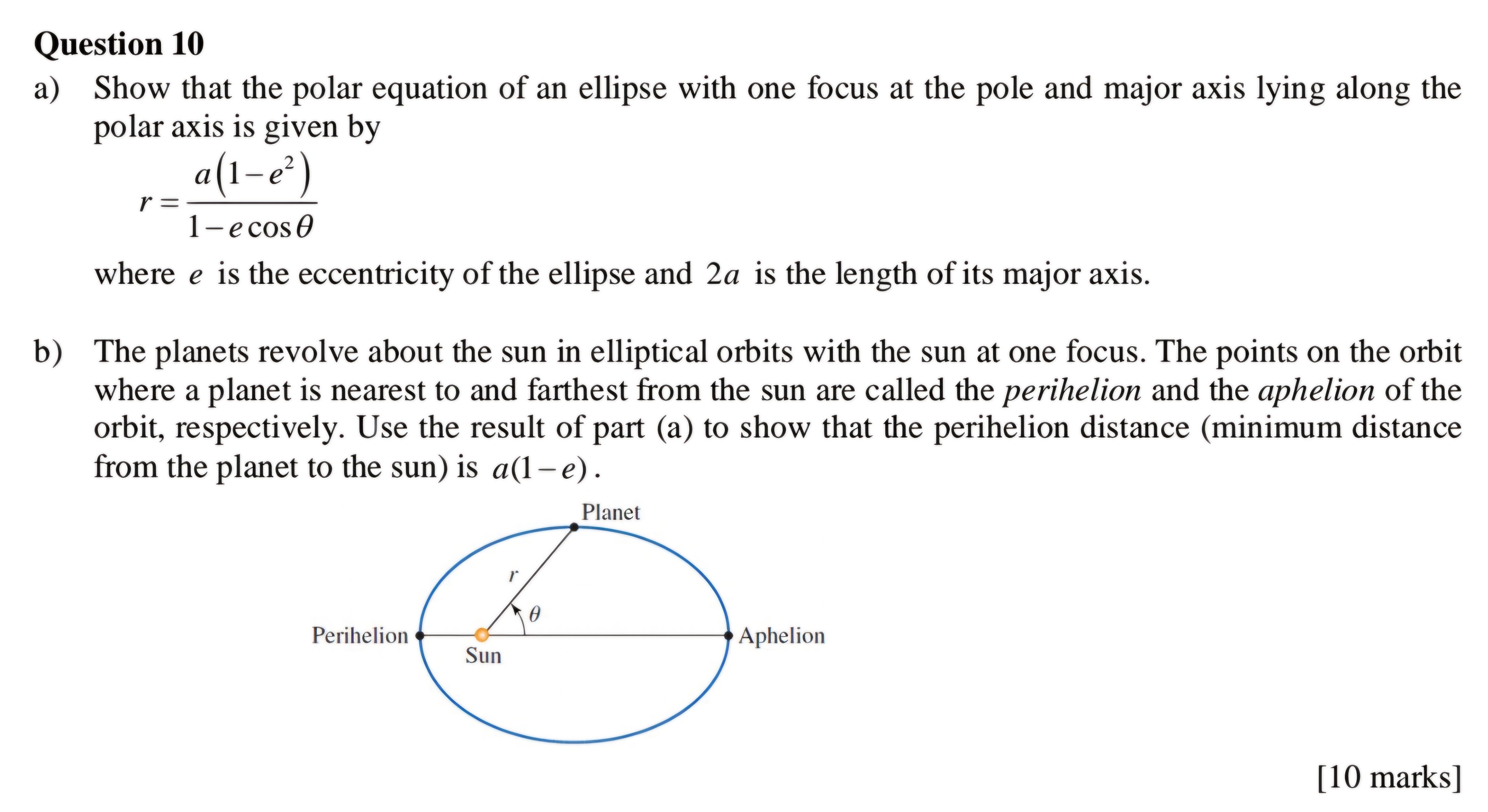 Question 10 a) Show that the polar equation of an ellipse with one focus at the pole and major axis lying along the polar axis is given by