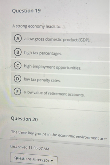 Question 19 A strong economy leads to: a low gross domestic product (GDP). high tax percentages. high employment opportunities. low tax penalty rates. a low value of retirement accounts. Question 20 The three key groups in the economic environment are: -. Last saved 11:06:07 AM