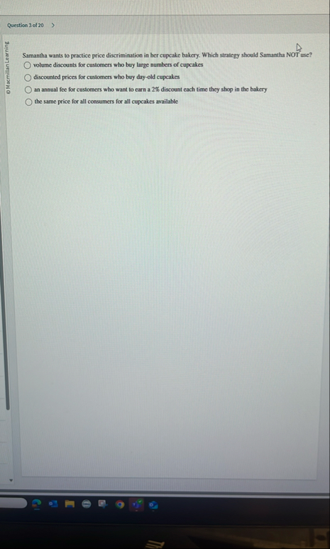 Question 3 of 20 Samantha wants to practice price discrimination in her cupcake bakery. Which strategy should Samantha NOT Ese? OMacmilan Learning