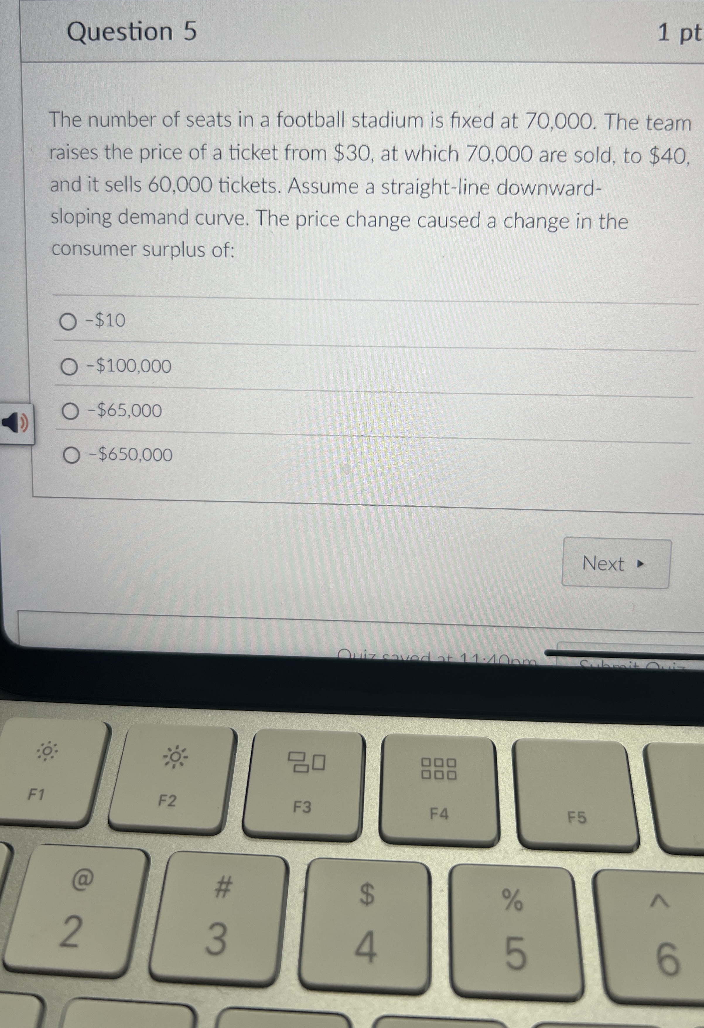 Question 5 1 pt The number of seats in a football stadium is fixed at 70,000 . The team raises the price of a ticket from