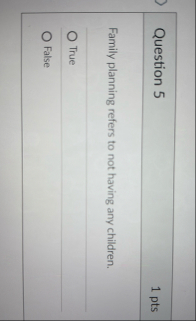 (Solved): Question 5 1 pts Family planning refers to not having any children. True False ...