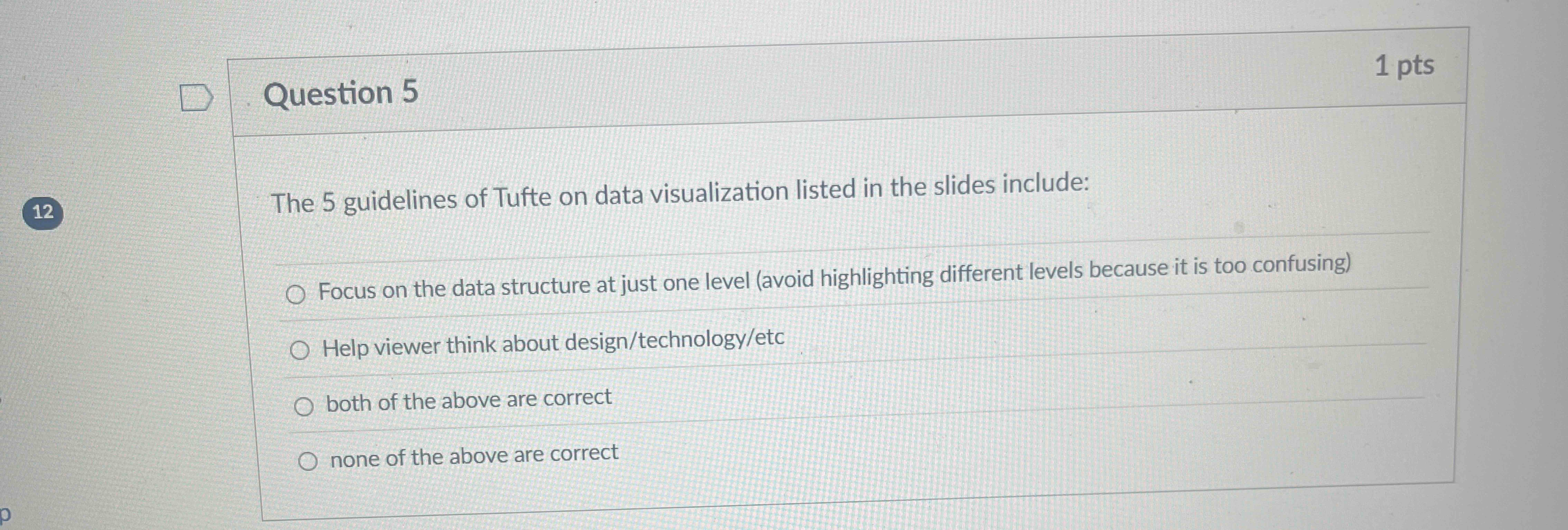 Question 5 The 5 guidelines of Tufte on data visualization listed in the slides include:Focus on the data structure at just one level (avoid highlighting different levels because it is too confusing)Help viewer think about design/technology/etcboth of the above are correctnone of the above are correct