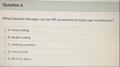 Question 6 What behavior therapies can the NP recommend to treat urge incontinence? A. timed voiding B. double voiding C. smoking cessation D. only