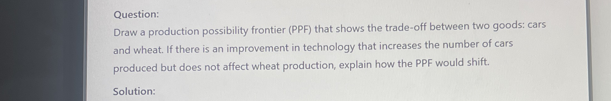 Question: Draw a production possibility frontier (PPF) that shows the trade-off between two goods: cars and wheat. If there is an improvement in technology that increases the number of cars produced but does not affect wheat production, explain how the PPF would shift. Solution: