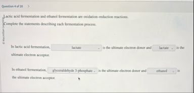 Quistion 4 of 20 ? Jactic acid fermentation and ethanol fermentation are oxidation-reduction reactions. Complete the statements describing each fermentation process. In lactic acid fermentation,