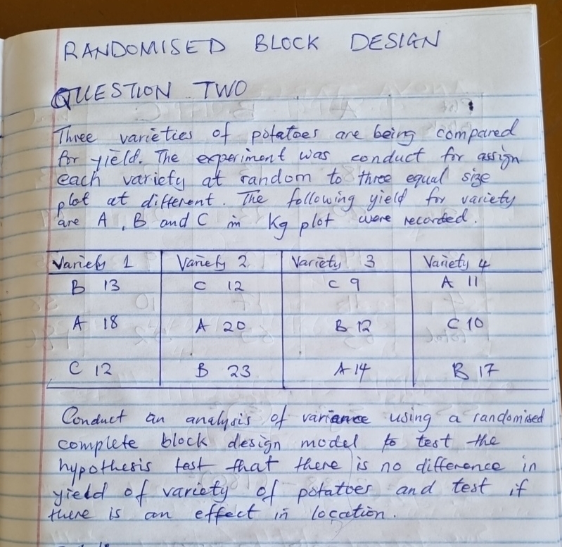 RANDOMISED BLOCK DESIGN QUESTION TWO Three varieties of potatoes are being compared for yield. The experiment was conduct for assign each variefy at random to three equal size plot at different. The following yield for variety are