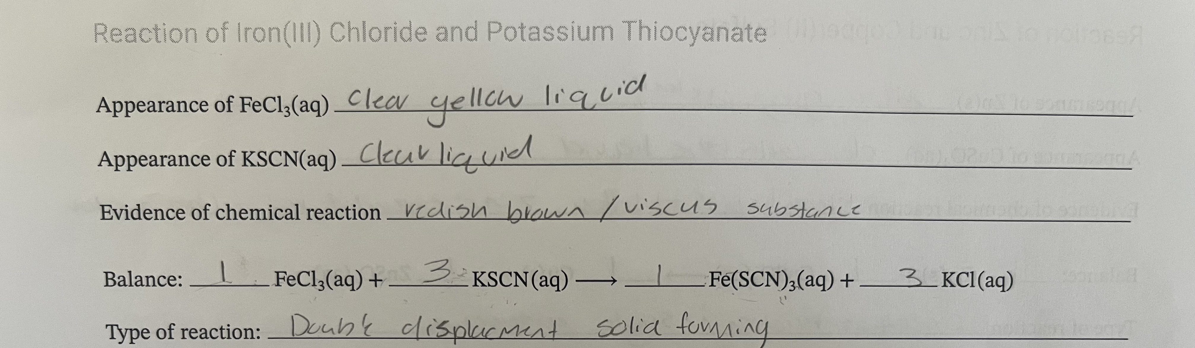Balance: 1,FeCl_(3)(aq)+,3KSCN(aq)longrightarrow,1,Fe(SCN)_(3)(aq)+,3,KCl(aq)