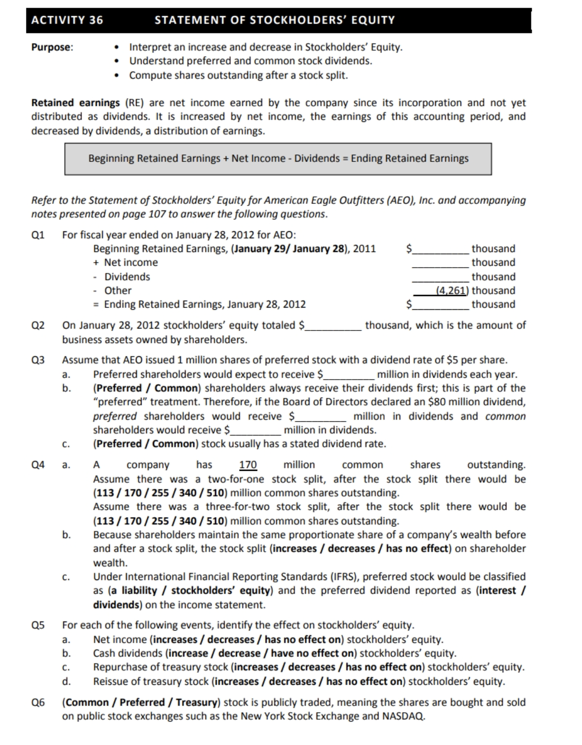 Refer to the Statement of Stockholders’ Equity for American Eagle Outfitters (AEO), Inc. and accompanying notes presented on page 107 to answer the following questions. Q1 For fiscal year ended on January 28, 2012 for AEO: Beginning Retained Earnings, (January 29/ January 28), 2011 + Net income - Dividends - Other = Ending Retained Earnings, January 28, 2012 $__________ thousand __________ thousand __________ thousand ____(4,261) thousand $__________ thousand Q2 On January 28, 2012 stockholders’ equity totaled $__________ thousand, which is the amount of business assets owned by shareholders.