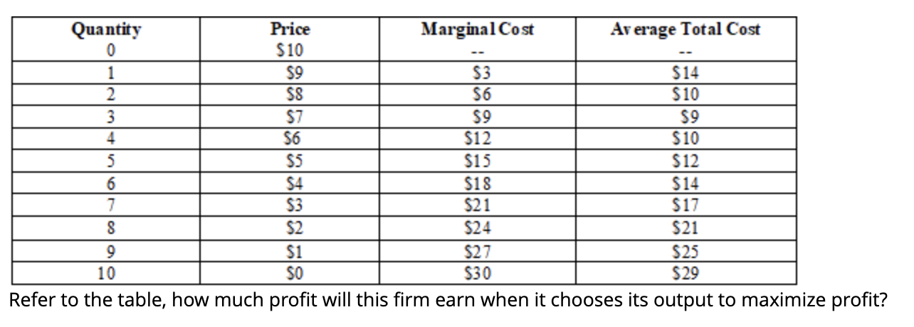 Refer to the table, how much profit will this firm earn when it chooses its output to maximize profit?