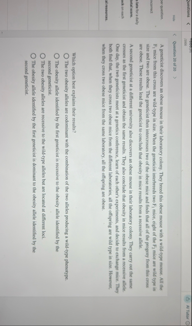 Ruestions 12000 Al Tutor (C) Hide ser question. ncorrect s late for a daily total score. sck on each al resources. Question 20 of 20 A geneticist discovers an obese mouse in their laboratory colony. They breed this obese mouse with a wild-type mouse. All the