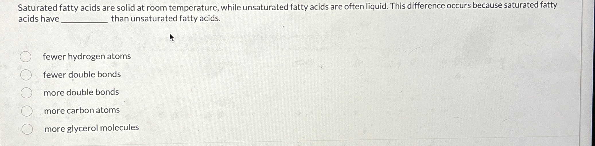 ?than unsaturated fatty acids. fewer hydrogen atoms fewer double bonds more double bonds more carbon atoms more glycerol molecules