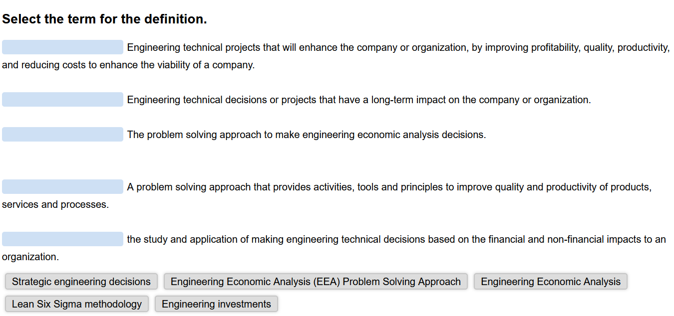 Select the term for the definition. Engineering technical projects that will enhance the company or organization, by improving profitability, quality, productivity, and reducing costs to enhance the viability of a company. Engineering technical decisions or projects that have a long-term impact on the company or organization. The problem solving approach to make engineering economic analysis decisions. A problem solving approach that provides activities, tools and principles to improve quality and productivity of products, services and processes. the study and application of making engineering technical decisions based on the financial and non-financial impacts to an organization.