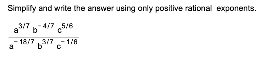 Simplify and write the answer using only positive rational exponents. (a^((3)/(7))b^(-(4)/(7))c^((5)/(6)))/(a^(-(18)/(7))b^((3)/(7))c^(-(1)/(6)))