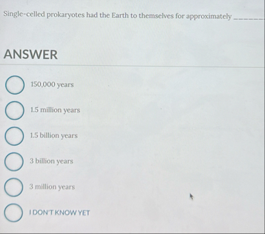 ANSWER 150,000 years 1.5 million years 1.5 billion years 3 billion years 3 million years IDON'T KNOW YET