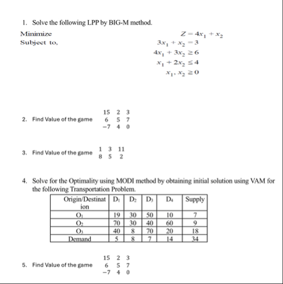 Solve the following LPP by BIG-M method. Minimize Subject to,