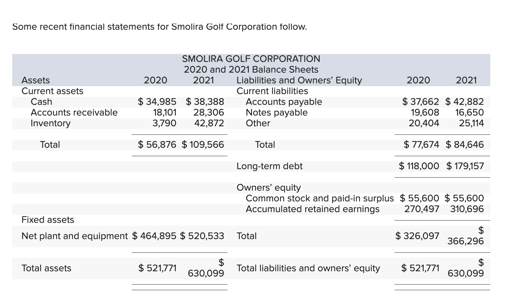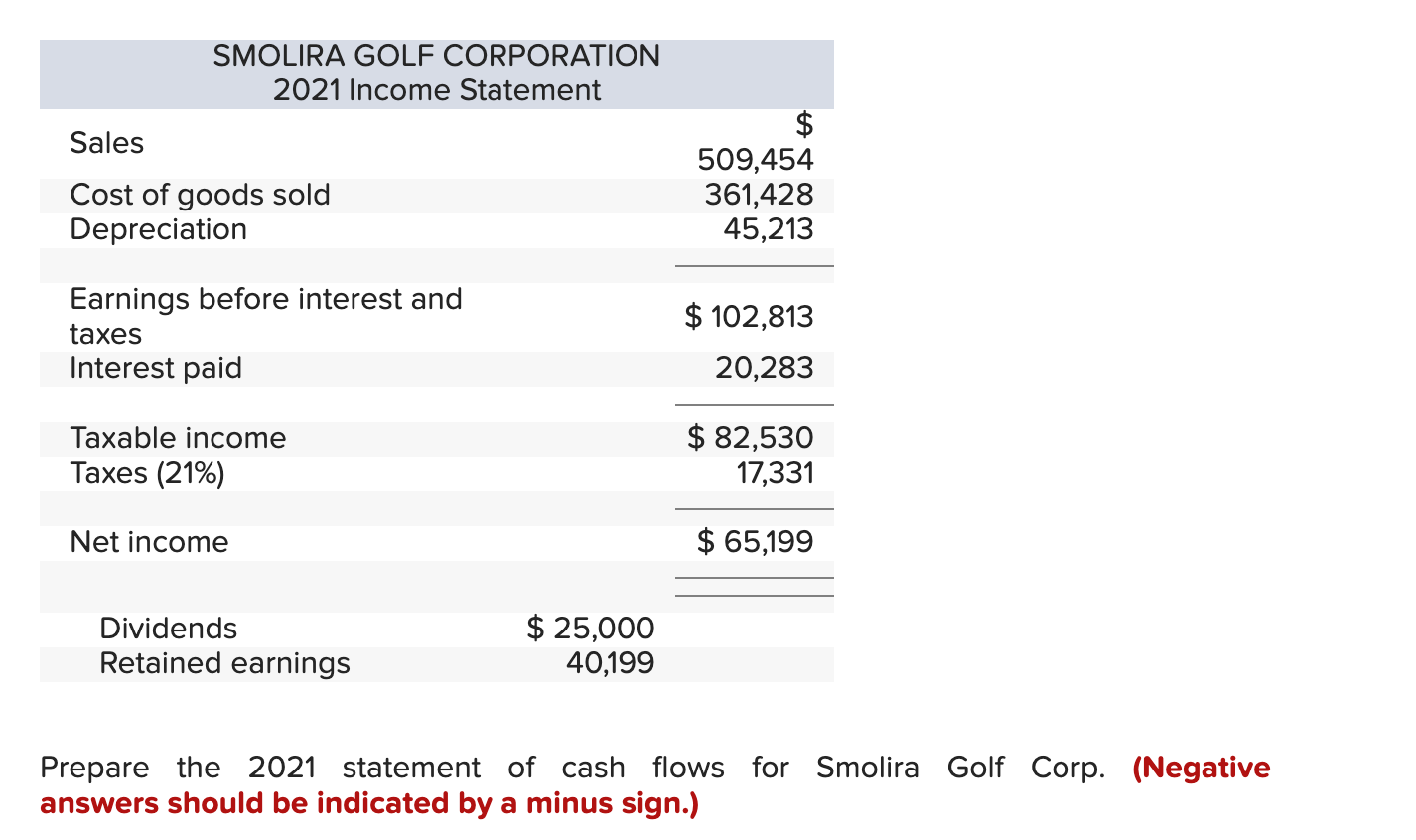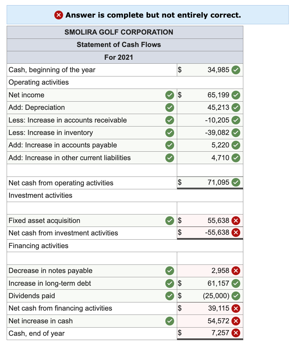 Some recent financial statements for Smolira Golf Corporation follow. \table[[\table[[SMOLIRA GOLF CORPORATION],[2021 Income Statement]]],[Sales,\table[[$],[509,454]]],[Cost of goods sold,361,428],[Depreciation,45,213],[\table[[Earnings before interest and],[taxes]],$102,813],[Interest paid,20,283],[Taxable income,$82,530],[Taxes (21%),17,331],[Net income,$65,199],[Dividends,],[Retained earnings,]] Prepare the 2021 statement of cash flows for Smolira Golf Corp. (Negative answers should be indicated by a minus sign.)-Answer is complete but not entirely correct.