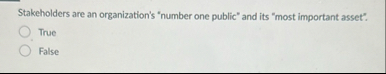 (Solved): Stakeholders are an organization's "number one public" and its "most important asset". True False ...