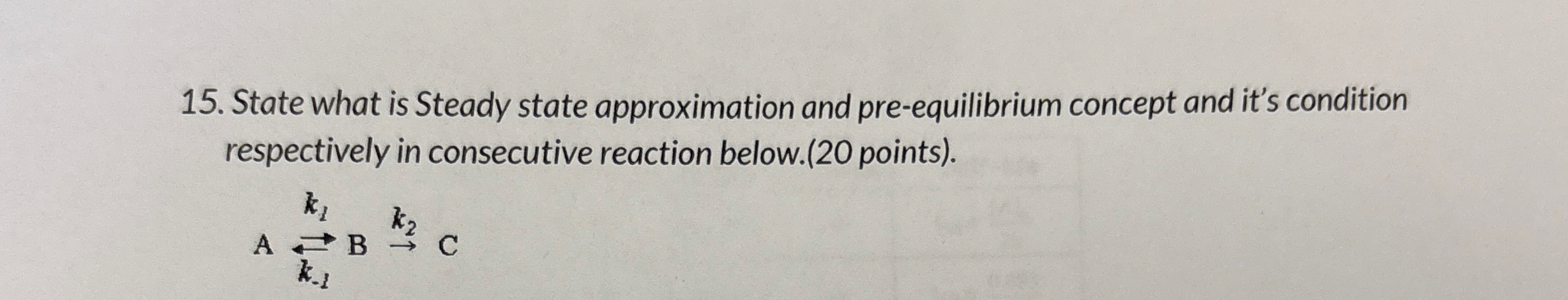 State what is Steady state approximation and pre-equilibrium concept and it's condition respectively in consecutive reaction below.(20 points).
