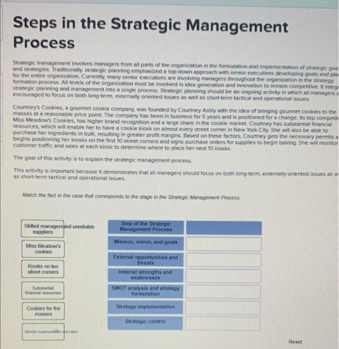 Steps in the Strategic Management Process Strategic management involves managers from all parts of the organization in the formulation and implementation of strategic goa and strategies. Traditionally, strategic planning emphasized a top-down approach with senior executives developing goals and pla for the entire organization. Currently, many senior executives are involving managers throughout the organization in the strategy formation process. All levels of the organization must be involved in idea generation and innovation to remain competitive. It integr strategic planning and management into a single process. Strategic planning should be an ongoing activity in which all managers a encouraged to focus on both long-term, externally oriented issues as well as short-term tactical and operational issues. Courtney's Cookies, a gourmet cookie company, was founded by Courtney Ashly with the idea of bringing gourmet cookies to the masses at a reasonable price point. The company has been in business for 5 years and is positioned for a change. Its top competiti Miss Meadow's Cookies, has higher brand recognition and a large share in the cookie market. Courtney has substantial financial resources, which will enable her to have a cookie kiosk on almost every street corner in New York City. She will also be able to purchase her ingredients in bulk, resulting in greater profit margins. Based on these factors, Courtney gets the necessary permits a begins positioning her kiosks on the first 10 street corners and signs purchase orders for supplies to begin baking. She will monitor customer traffic and sales at each kiosk to determine where to place her next 10 kiosks. The goal of this activity is to explain the strategic management process. This activity is important because it demonstrates that all managers should focus on both long-term, externally-oriented issues as w as short-term tactical and operational issues. Match the fact in the case that corresponds to the stage in the Strategic Management Process Skilled managersand unreliable suppliers Step of the Strategic Management Process Mission, vision, and goals Miss Meadow's cookies External opportunities and threats Kiosks on ten street comers Internal strengths and weaknesses Substantial financial resources SWOT analysis and strategy formulation Strategy implementation Cookies for the masses Strategic control Reset Mon c