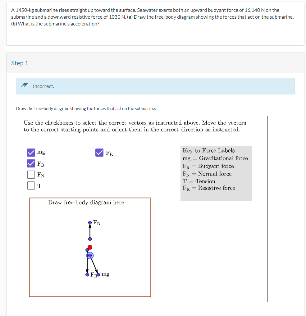 ?Incorrect. Draw the free-body diagram showing the forces that act on the submarine. Use the checkboxes to select the correct vectors as instructed above. Move the vectors to the correct starting points and orient them in the correct direction as instructed. mg