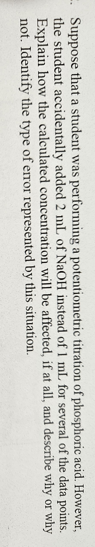 Suppose that a student was performing a potentiometric titration of phosphoric acid. However, the student accidentally added 2 mL of NaOH instead of 1 mL for several of the data points. Explain how the calculated concentration will be affected, if at all, and describe why or why not. Identify the type of error represented by this situation.