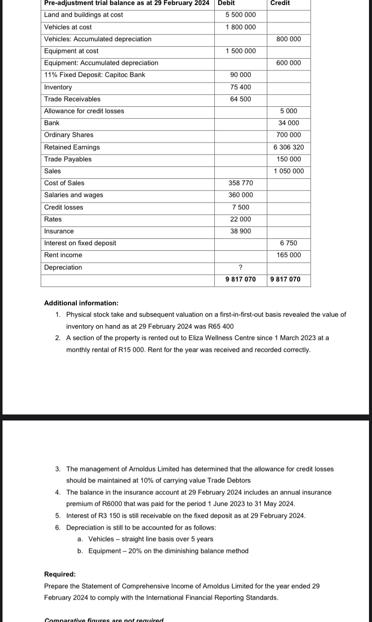 \table[[Pre-adjustment trial balance as at 29 February 2024,Debit,Credit],[Land and buildings at cost,5500000,],[Vehicles at cost,1800000,],[Vehicles: Accumulated depreciation,,800000],[Equipment at cost,1500000,],[Equipment: Accumulated depreciation,,600000],[11% Fixed Deposit: Capitoc Bank,90000,],[Inventory,75400,],[Trade Receivables,64500,],[Allowance for credit losses,,5000],[Bank,,34000],[Ordinary Shares,,700000],[Retained Earnings,,6306320],[Trade Payables,,150000],[Sales,,1050000],[Cost of Sales,358770,],[Salaries and wages,360000,],[Credit losses,7500,],[Rates,22000,],[Insurance,38900,],[Interest on fixed deposit,,6750],[Rent income,,165000],[Depreciation,?,],[9817070,9817070]] Additional information: Physical stock take and subsequent valuation on a first-in-first-out basis revealed the value of inventory on hand as at 29 February 2024 was R65 400 A section of the property is rented out to Eliza Wellness Centre since 1 March 2023 at a monthly rental of R15 000. Rent for the year was received and recorded correctly. The management of Arnoldus Limited has determined that the allowance for credit losses should be maintained at