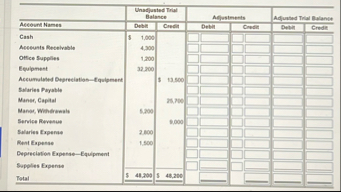 \table[[,Unadfusted Trial Balance,Affustments,Adfusted Trial Balanse],[Aseount Names,Debre,Credit,Devin,Conedi:,Devin,Credit],[Cash,s 1,000,,,