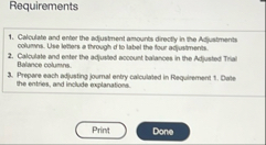 ?Requirements Calculate and enter the adjustment amourts directly in the Adjustments columns. Use letters a through d to label the four affustmants. Calcuste and enter the adfusted accourt batances in the Adjusted Trial Balance columns. Prepare each affusting journal entry caloulated in Repulrement 1. Date the entries, and include explanations. Requirements Calculate and enter the adjustment amourts directly in the Adjustments columns. Use letters a through d to label the four affustmants. Calcuste and enter the adfusted accourt batances in the Adjusted Trial Balance columns. Prepare each affusting journal entry caloulated in Repulrement 1. Date the entries, and include explanations. More info a. Service reverue accrued,