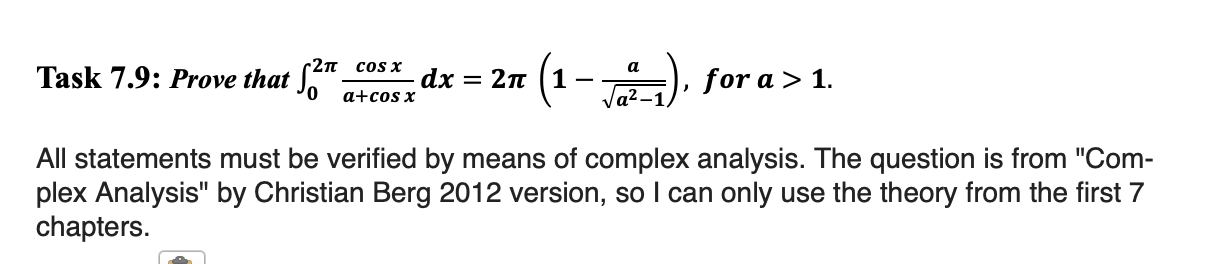 Task 7.9: Prove that \int_0^(2\pi ) (cosx)/(a+cosx)dx=2\pi (1-(a)/(\sqrt(a^(2)-1))), for a>1.