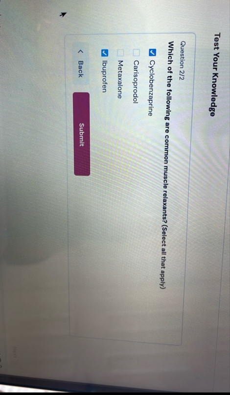 Which of the following are common muscle relaxants? (Select all that apply) Cyclobenzaprine Carisoprodol Metaxalone Ibuprofen