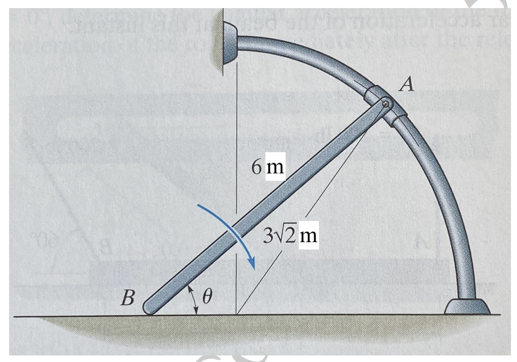The 25 kg-heavy, 6 m-long slender rod AB slides without friction on the ground and on the circular bar of radius 3\sqrt(2) m. The rod is left free from rest from the configuration shown in Figure 1, where \theta = 30 degrees. Determine the angular velocity and angular acceleration of the rod at the instant right before it becomes horizontal and its end A hits the ground. The acceleration of gravity is g = 9.81( m)/(s^(2)) Figure 1: A rod sliding without friction on the ground and one a circular bar.
