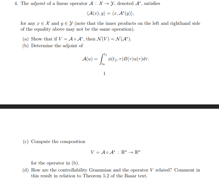 The adjoint of a linear operator A:x->Y, denoted A^(*), satisfies (:A(x),y:)=(:x,A^(*)(y):) for any xinx and yinY (note that the inner products on the left and righthand side of the equality above may not be the same operation). (a) Show that if V=A@A^(*), then N(V)=N(A^(*)). (b) Determine the adjoint of A(u)=\int_(t_(0))^(t_(f)) \phi (t_(f),\tau )B(\tau )u(\tau )d\tau (c) Compute the composition V=A@A^(*):R^(n)->R^(n) for the operator in (b). (d) How are the controllability Grammian and the operator V related? Comment in this result in relation to Theorem 5.2 of the Basar text.