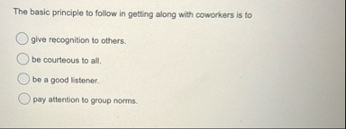 (Solved): The basic principle to follow in getting along with coworkers is to