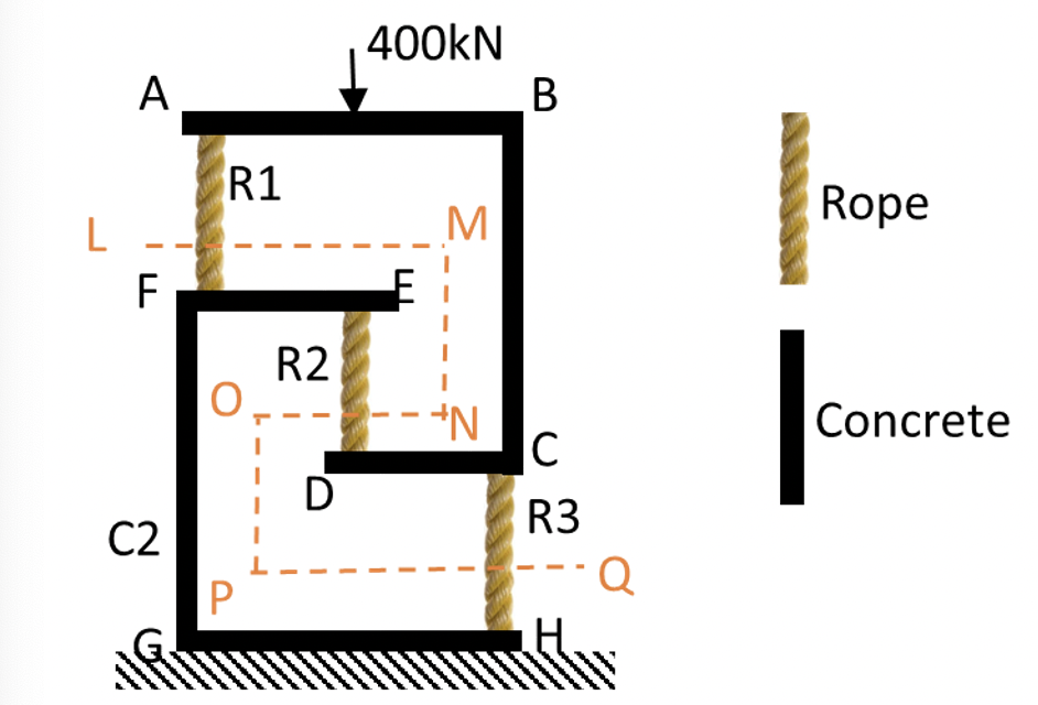 The below tensegrity structure contained 3 ropes (R1, R2 and R3) and 2 concrete members (ABCD and EFGH). (a) Draw 2 free body diagram for the components above and below section LMNOPQ. (b) Determine forces in all ropes. (c) Draw bending moment, shear force and axial force diagram for 2 concrete members (ABCD and EFGH). (d) Provide the definitions of tensegrity structure, the advantage of the structure and related reference source.