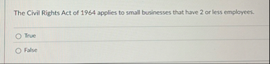(Solved): The Civil Rights Act of 1964 applies to small businesses that have 2 or less employees. True Fal ...