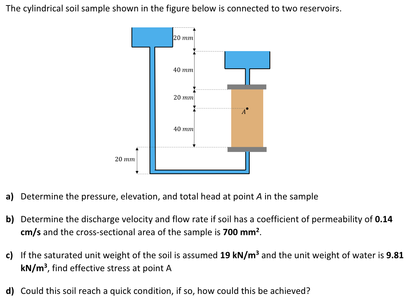 The cylindrical soil sample shown in the figure below is connected to two reservoirs. a) Determine the pressure, elevation, and total head at point