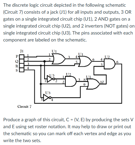 The discrete logic circuit depicted in the following schematic (Circuit 7) consists of a jack (J1) for all inputs and outputs, 3 OR gates on a single integrated circuit chip (U1), 2 AND gates on a single integrated circuit chip (U2), and 2 inverters (NOT gates) on single integrated circuit chip (U3). The pins associated with each component are labeled on the schematic. Crean , Produce a graph of this circuit, \( \mathrm{C}=(\mathrm{V}, \mathrm{E}) \) by producing the sets V and E using set roster notation. It may help to draw or print out the schematic so you can mark off each vertex and edge as you write the two sets.