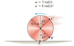 The disk has an angular acceleration \alpha = 8 rad/s2 and angular velocity \omega = 3 rad/s at the instant shown in the figure.