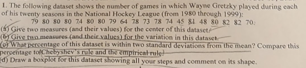 The following dataset shows the number of games in which Wayne Gretzky played during each of his twenty seasons in the National Hockey League (from 1980 through 1999): (4) Give two measures (and their values) for the center of this dataset (b) Give two measures (and their values) for the variation in this dataset: (o) What percentage of this dataset is within two standard deviations from the mean? Compare this percentage to/Chebyshev's rule and the empirical rule? (d) Draw a boxplot for this dataset showing all your steps and comment on its shape.