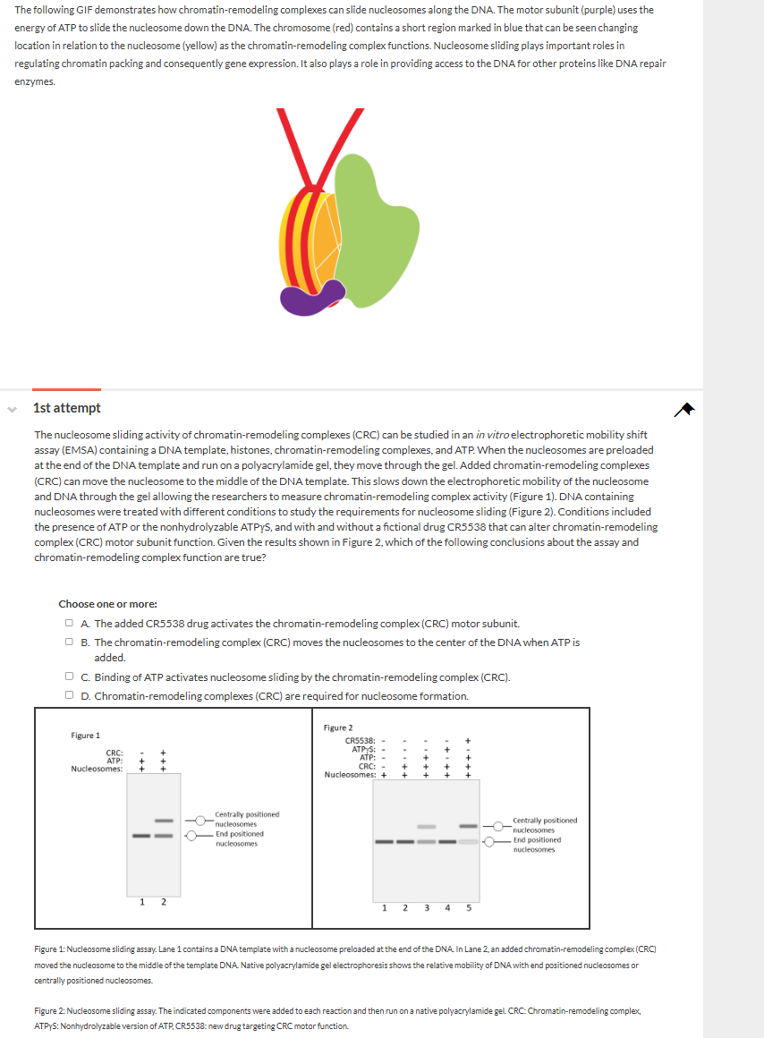 The following GIF demonstrates how chromatin-remodeling complexes can slide nucleosomes along the DNA. The motor subunit (purple) uses the energy of ATP to slide the nucleosome down the DNA. The chromosome (red) contains a short region marked in blue that can be seen changing location in relation to the nucleosome (yellow) as the chromatin-remodeling complex functions. Nucleosome sliding plays important roles in regulating chromatin packing and consequently gene expression. It also plays a role in providing access to the DNA for other proteins like DNA repair enzymes. 1st attempt The nucleosome sliding activity of chromatin-remodeling complexes (CRC) can be studied in an in vitro electrophoretic mobility shift assay (EMSA) containing a DNA template, histones, chromatin-remodeling complexes, and ATP. When the nucleosomes are preloaded at the end of the DNA template and run on a polyacrylamide gel, they move through the gel. Added chromatin-remodeling complexes (CRC) can move the nucleosome to the middle of the DNA template. This slows down the electrophoretic mobility of the nucleosome and DNA through the gel allowing the researchers to measure chromatin-remodeling complex activity (Figure 1). DNA containing nucleosomes were treated with different conditions to study the requirements for nucleosome sliding (Figure 2). Conditions included the presence of ATP or the nonhydrolyzable ATP \( \gamma \) S, and with and without a fictional drug CR5538 that can alter chromatin-remodeling complex (CRC) motor subunit function. Given the results shown in Figure 2, which of the following conclusions about the assay and chromatin-remodeling complex function are true? Choose one or more: \( \square \) A. The added CR5538 drug activates the chromatin-remodeling complex (CRC) motor subunit. B. The chromatin-remodeling complex (CRC) moves the nucleosomes to the center of the DNA when ATP is added. C. Binding of ATP activates nucleosome sliding by the chromatin-remodeling complex (CRC). D. Chromatin-remodeling complexes (CRC) are required for nucleosome formation. Figure 1 Figure 1: Nucleosome sliding assay. Lane 1 contains a DNA template with a nucleosome preloaded at the end of the DNA. In Lane 2, an added chromatin-remodeling complex (CRC) moved the nucleosome to the middle of the template DNA. Native polyacrylamide gel electrophoresis shows the relative mobility of DNA with end positioned nucleosomes or centrally positioned nucleosomes. Figure 2: Nucleosome sliding assay. The indicated components were added to each reaction and then run on a native polyacrylamide gel. CRC: Chromatin-remodeling complex, ATP YS: Nonhydrolyzable version of ATP, CR5538: new drug targeting CRC motor function.