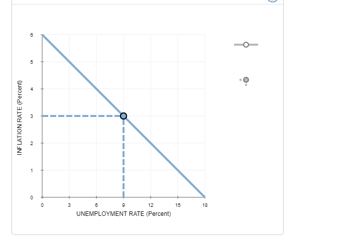In the short run, an unexpected increase in the money supply results in in the inflation rate and in the unemployment rate. On the following graph, shift the curve or drag the blue point along the curve, or do both, to show the long-run effects of the increase in the money supply.