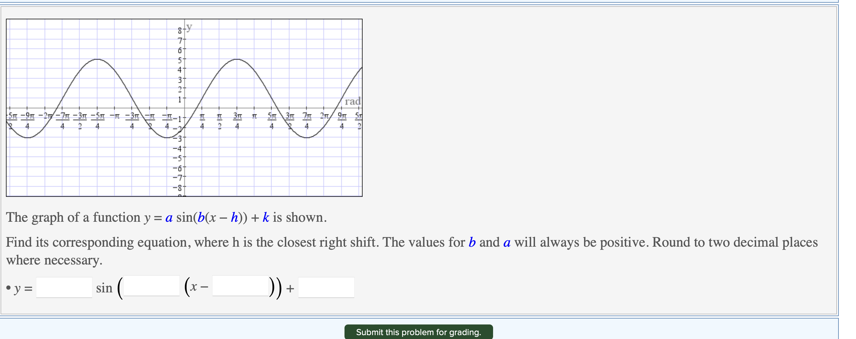 y=asin(b(x-h))+kis shown. Find its corresponding equation, where h is the closest right shift. The values for