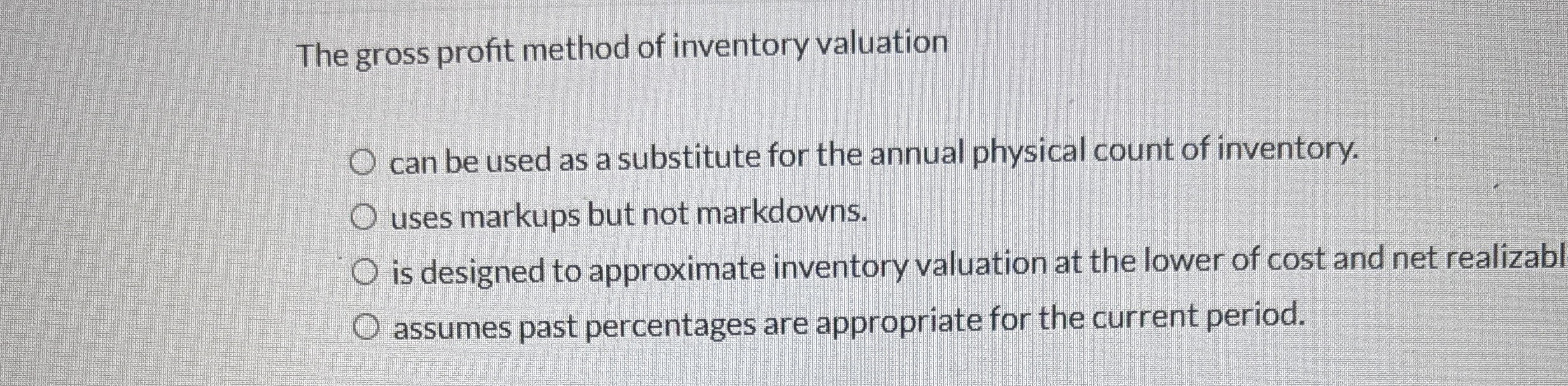 The gross profit method of inventory valuation can be used as a substitute for the annual physical count of inventory. uses markups but not markdowns. is designed to approximate inventory valuation at the lower of cost and net realizabl assumes past percentages are appropriate for the current period.